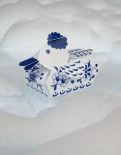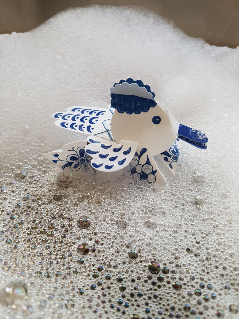 Deze vouwbare Delftsblauwe bad-eend is gemaakt van recyclebaar polypropyleen en kan echt mee in bad.