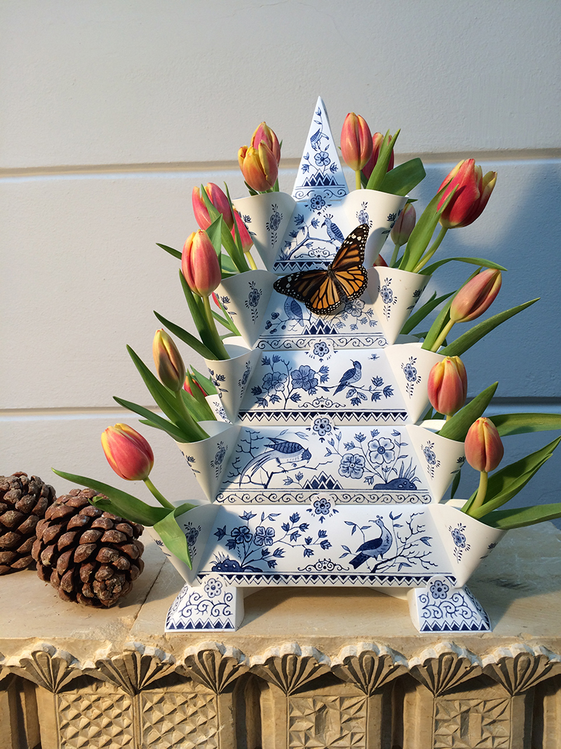 Een moderne versie van een Delftse tulpenvaas uit de 17e eeuw, gemaakt van waterdicht polypropyleen.