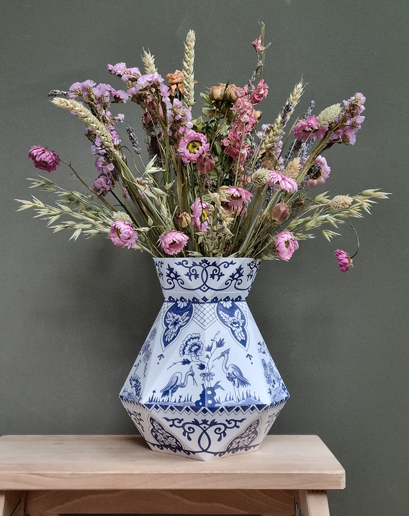 Deze vouwbare, achthoekige, papieren vaas is gedecoreerd met Delftsblauwe motieven uit de 17e eeuw.