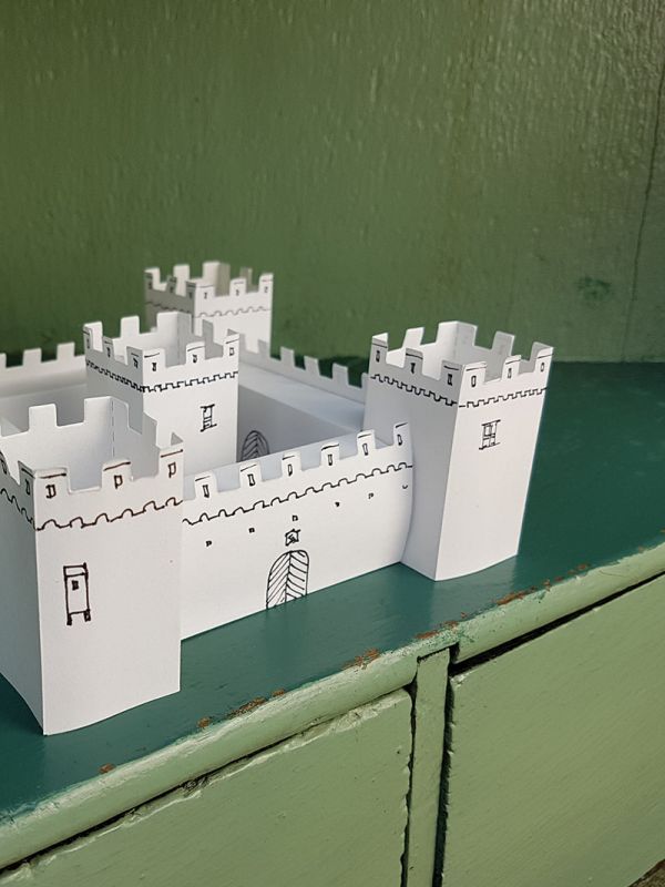 Plak elk onderdeel in elkaar met de lijm die al op het velletje zit. Laat je inspireren door de historische voorbeelden aan de binnenkant van dit mapje en teken er ramen, en poorten op.