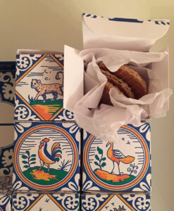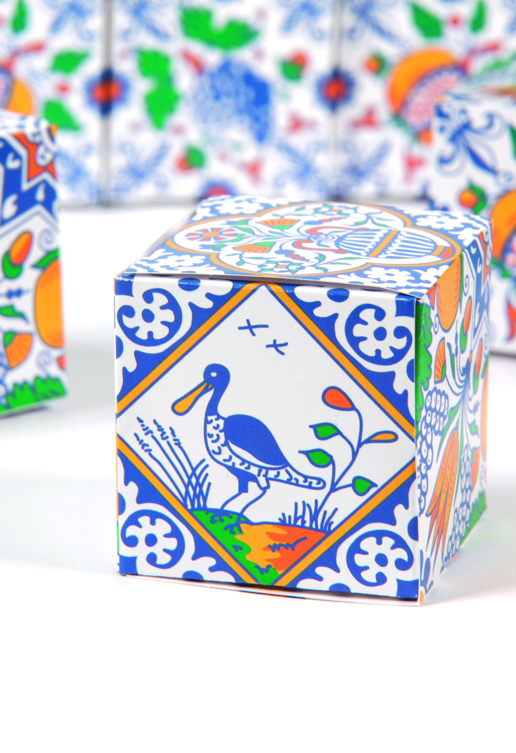 Op de doosjes staan Hollandse tegels uit de vroege 17e eeuw. Deze veelkleurige tegels werden veel in Nederland gemaakt toend de bekende blauw-witte Delftse versie nog niet bestond.