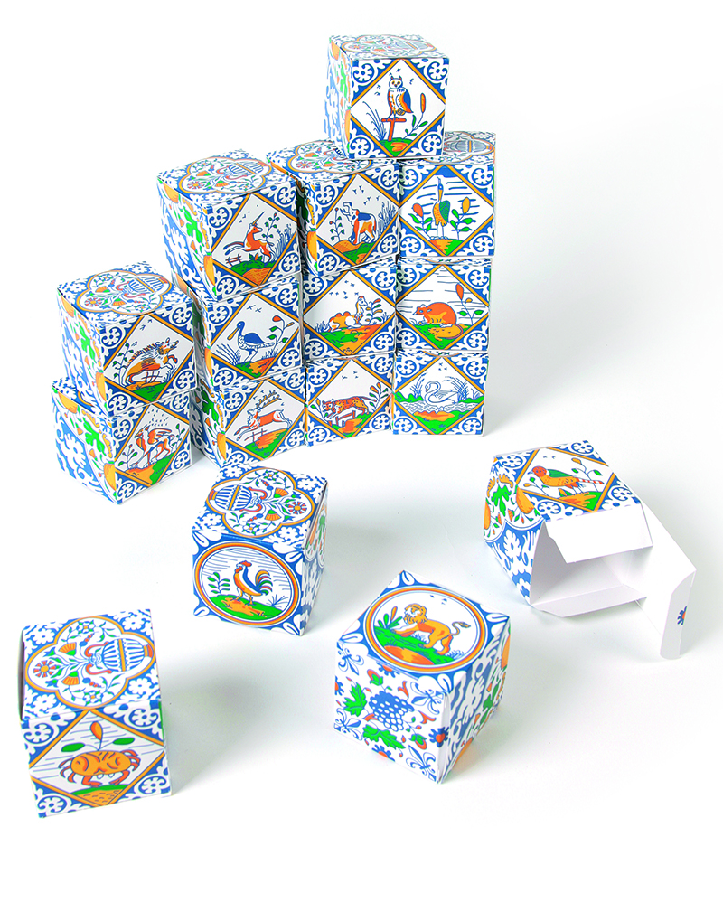 Maak je eigen blokpuzzel van deze kartonnen tegeldoosjes. Met deze 16 kartonnen doosjes kan je 6 verschillende, Oud-Hollandse tegeltableaux leggen.