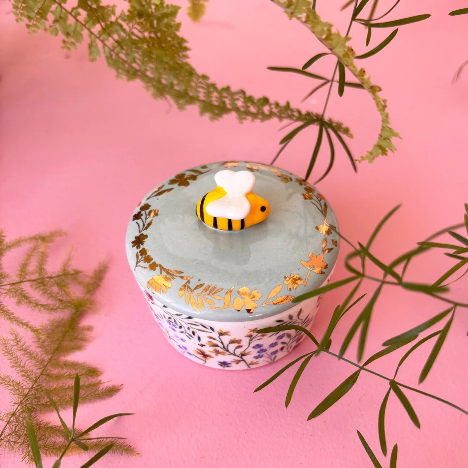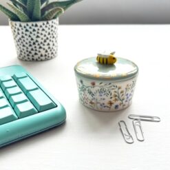 Breng de charme van een Engelse tuin in huis met dit bijen sieradenpotje. Een schattige 3D keramische bij rust op een turquoise deksel, genesteld tussen bladeren en bloemen met gouden folieaccenten, wat een speelse touch aan je interieur geeft. De crèmekleurige achtergrond en de delicate aquarelbladeren en subtiele gouden folieaccenten maken het potje extra magisch. Perfect voor het bewaren van sieraden, munten of kleine schatten, het zal zeker een favoriet worden op je dressoir of plank. Elk potje is uniek en kan enigszins afwijken door het handgemaakte karakter van het ontwerp.